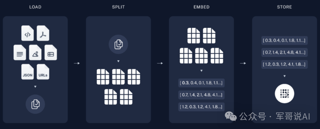 一是离线的知识数据向量化,包括加载数据/知识库、拆分文本、Embedding向量化处理,最后将向量化的数据块存储于VectorDB,以便于搜索。