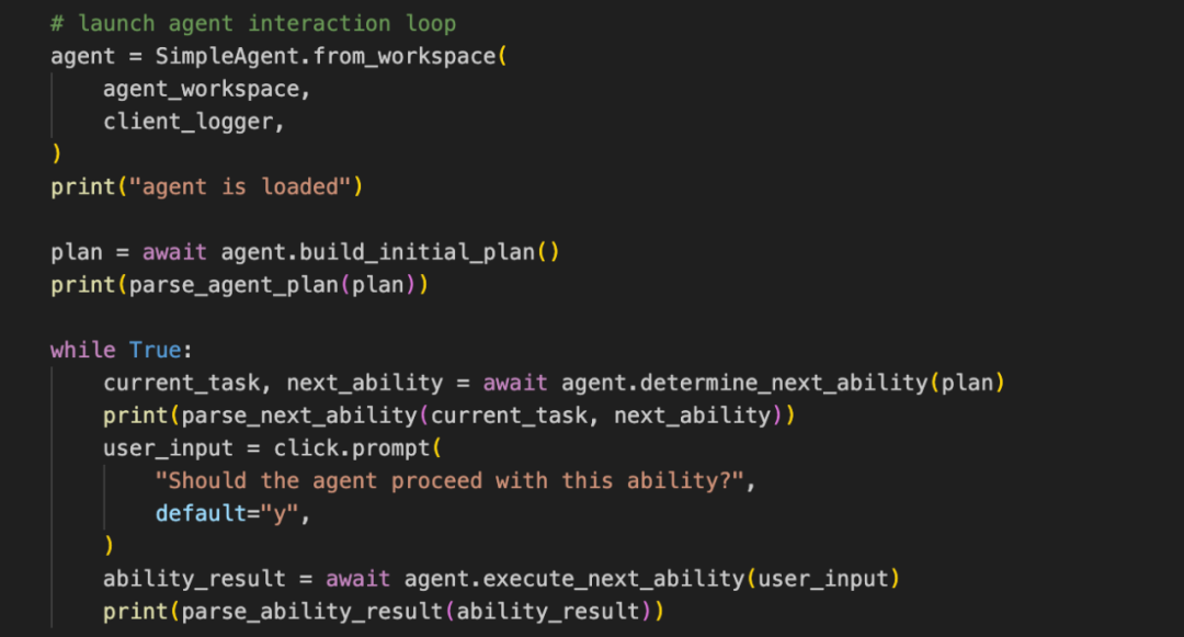 这个主要框架虽然相对简单,但其设计理念具有重要意义。首先,创建一个初始的计划,然后进入主循环。系统会让模型判断在当前计划下该进行何种行动,接着会执行行动。执行完毕后,结果会写入下一次循环中。如此,每次决策都会基于之前的结果、记忆和计划,从而制定出新的行动方案。