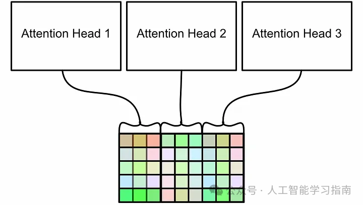 在这个例子中,我们有3个注意力头。因此,查询、键和值被分为3个部分,并传递给每个头。请注意,我们是沿着特征轴进行分割的,而不是单词轴。每个单词嵌入的不同方面被传递给不同的注意力头,但每个单词在每个注意力头中仍然存在。