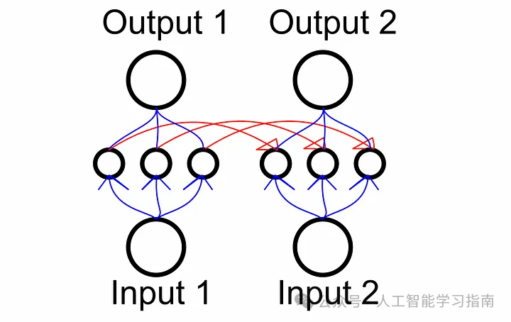 RNN的示意结构(假设有3个隐藏神经元并用于处理2个输入):图中红色箭头表示递归连接,它连接着来自后续递归层的信息。蓝色箭头表示内部连接,类似于密集层。为了说明起见,我们复制了神经网络,但请记住,网络实际上是反馈到自身的,这意味着第二个(及后续)模块的参数与第一个模块相同。