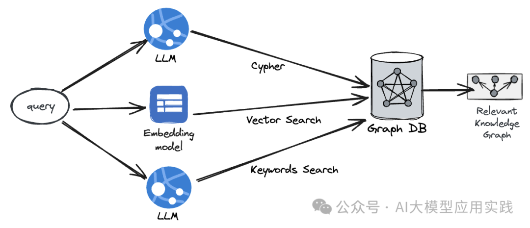 Text-to-Cypher(或其他Graph查询语言)。这在上一篇介绍结构化数据的知识图谱检索时已经介绍,即把自然语言用LLM转化为GraphDB能够理解的查询语言(比如Neo4j的Cypher)后进行检索。 Vector Search。这需要Graph数据库有对应的向量检索技术支持,即在创建Graph时能够对节点或关系做embedding(作为属性);在检索时再根据向量检索相似的节点与关系作为上下文。 Keywords Search。借助LLM从自然语言的输入提取关键词或者同义词,然后使用提取的关键词借助GraphDB的能力检索出关联的节点与关系作为后续生成的上下文。