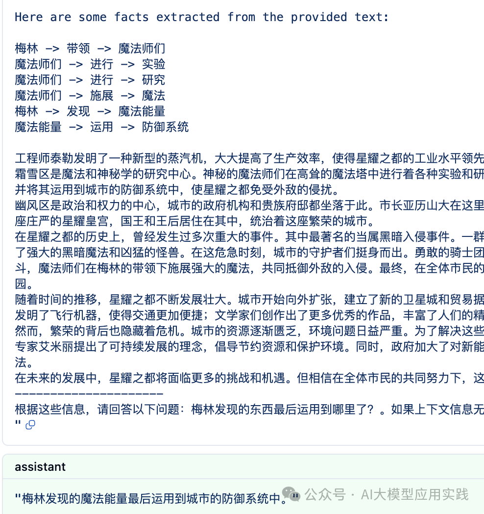 我们延续上面创建的知识图谱,基于LlamaIndex框架构建RAG检索与生成阶段的程序。这里先创建一个基于关键词的检索器,注意这里的prompt,是用来抽取输入中的关键词: ... defparse_fn(output: str)-> list[str]: matches = output.strip().split("^") keywords=[x.strip().capitalize()forxinmatchesifx.strip()] print(keywords) returnkeywords