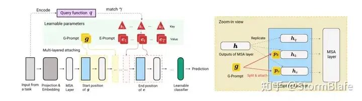 类似的Prompt Selection 算法很多,如DualPrompt算法,该算法将Prompt进行解耦,分化为General Prompt和Expert Prompt。General Prompt面向所有任务,为所有任务中共享信息,而Expert Prompt针对独立任务,数量与任务量一致。其采用了和L2P相同的key-query匹配策略。