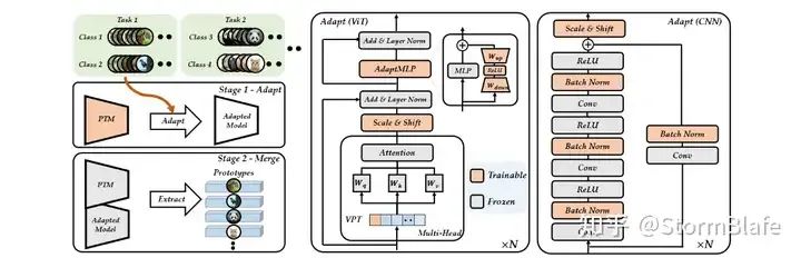 相较于前面将预训练模型的通用语和适应性分离处理的方式,SLCA算法采用了差异学习率调整和特征经验重播的方式进行持续学习研究。该算法使用较小的learn rate调整模型主体部分,而使用较大的learn rate 调节模型的classifier,以实现模型的逐步微调和classifier的快速适应。为了避免忘记以前的分类器,SLCA还对分类特征分布进行建模,并重播它们以校准classifier。