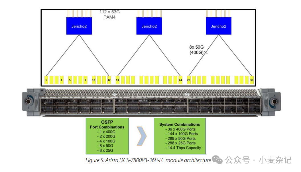 每个POD里16台middle layer switch,每台使用192个400G下联,按照文中的说法,在middle layer 到top layer 之间采用7:1的收敛比,考虑到7800上每个接口卡上支持36个400G,推测每个接口卡上实际有28个下行和4个上行,对应到整机就是224个下行和32个上行,共使用256个400G接口。