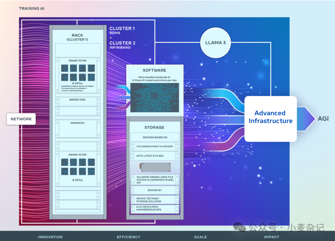 大意就是说Llama3.1 405B的模型训练用的是Meta自己设计的RoCE网络,用到的交换机型号主要是Arista 7800和Minipack2。