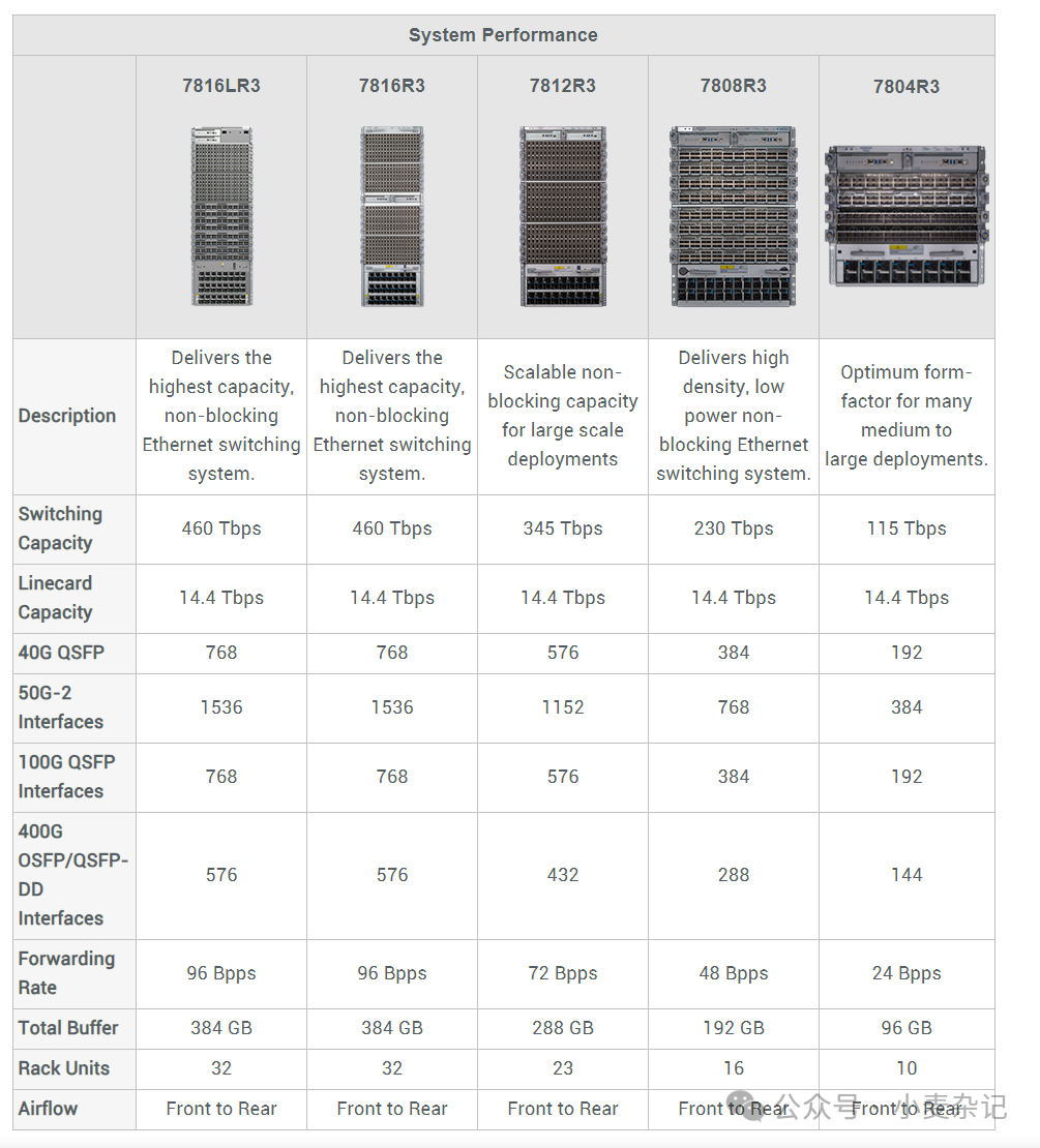 在middle layer和top layer,使用的自然就是Arista的7800交换机了,在Arista网站上看了一下,猜测用的应该是7808这个型号,因为每个POD里的middle layer交换机都要连接到同POD内的192个Minipack2, 只能支持192个400G的7804显然不够用了。