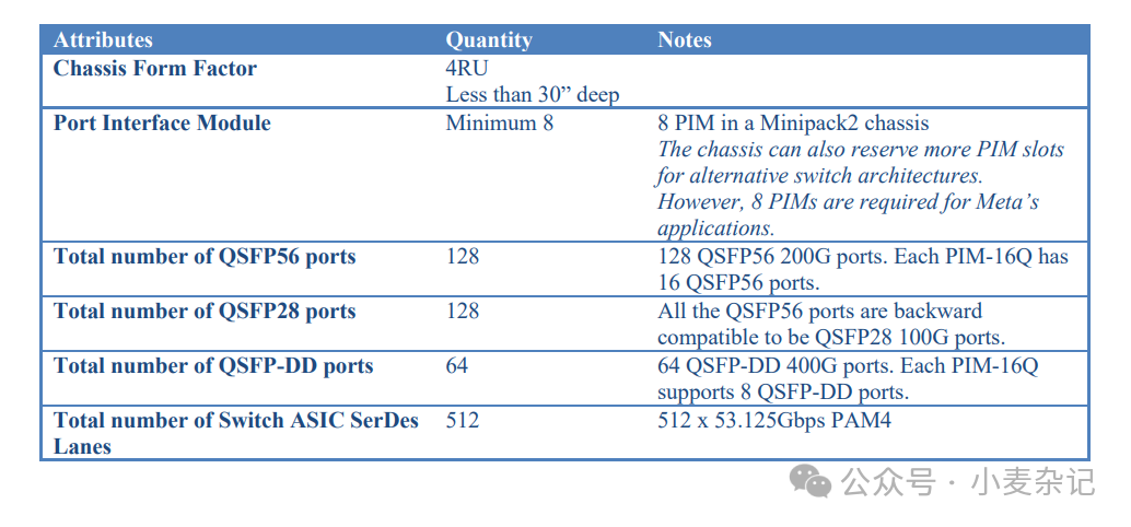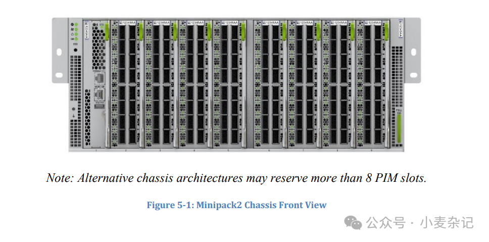 bottom layer 也就是TOR这一层用的是Minipack2交换机,Minipack2的SPEC可以在OCP网站上查到,大概就是如下图所示,4U高度,8个接口槽(PIM),整体设计跟Minipack1没太大变化,只是使用了Broadcom的TH4芯片,交换容量升级到了25.6T,支持的接口速率和数量相比Minipack1有了升级。
