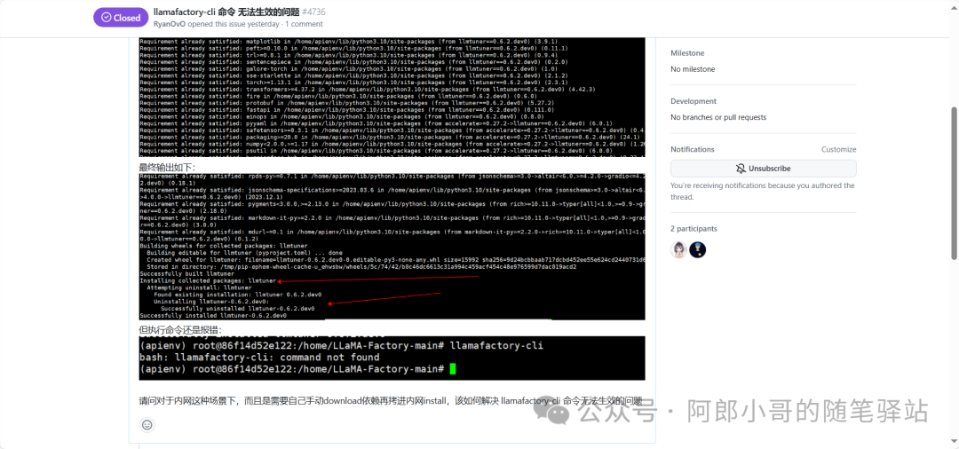 新版Llama-Factory改为了llamafactory-cli命令训练微调。但该命令默认是不存在的,需要在LlamaFactory源码的目录下运行 pip install -e .即可,官方文档已经写了需要事先运行该命令。但在离线环境下,就不能直接这么写,上述的命令列表已给出命令。不过当时还是出现了新的问题: