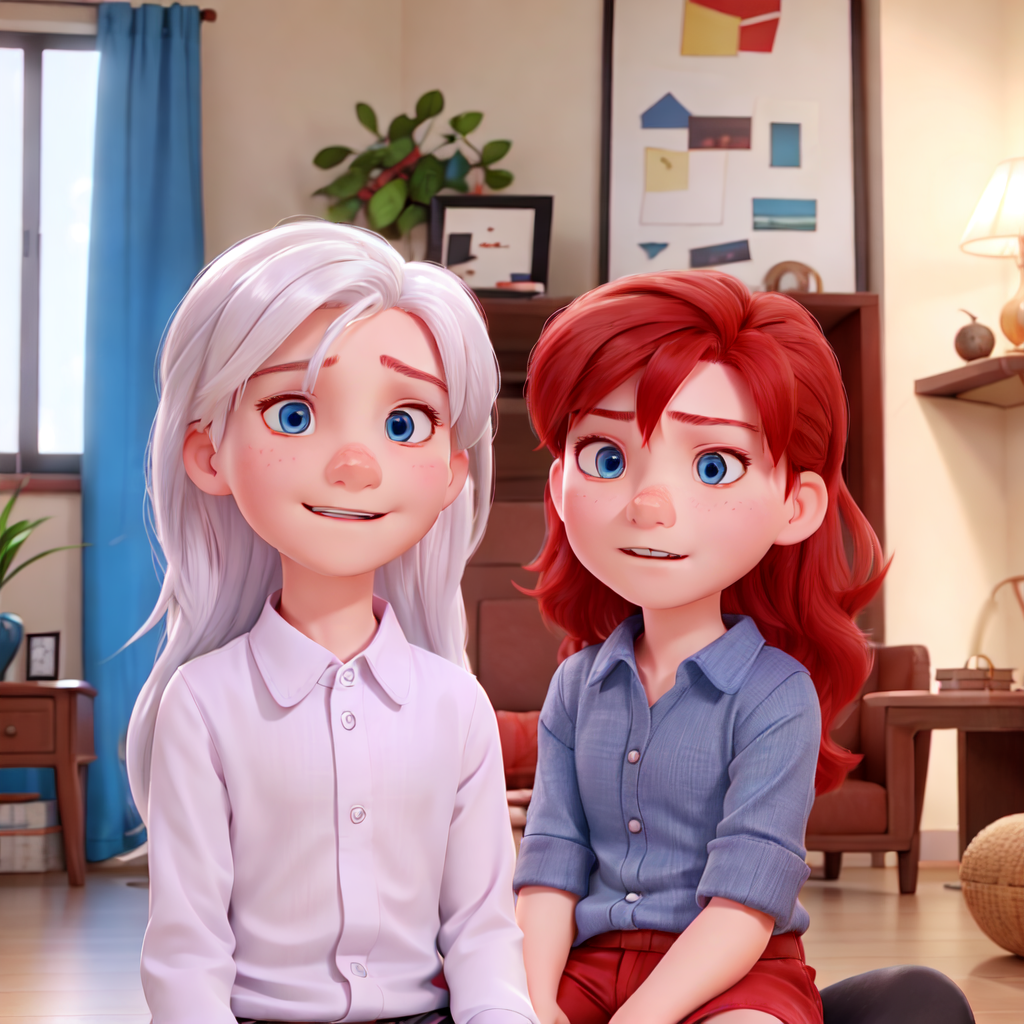 boy,whitehair,blueeyes,sittingonsofaandlaughing.girl,redhair,blueeyes,sittingonsofaandangry