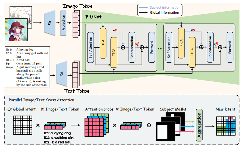 SD模型中的原始UNet利用交叉注意模块来挖掘文本特征,这些特征不足以表示多个主体的空间关系和特征。P-Unet是无需训练的布局调制注意力模块,P-Unet将UNet层的原始交叉关注模块分解为两个并行的文本和图像交叉关注模块(表示为PTCA和PICA)来细化Z。这两个模块具有相同的架构,其关键思想是计算Z与每主题文本/图像嵌入之间的特征相似度