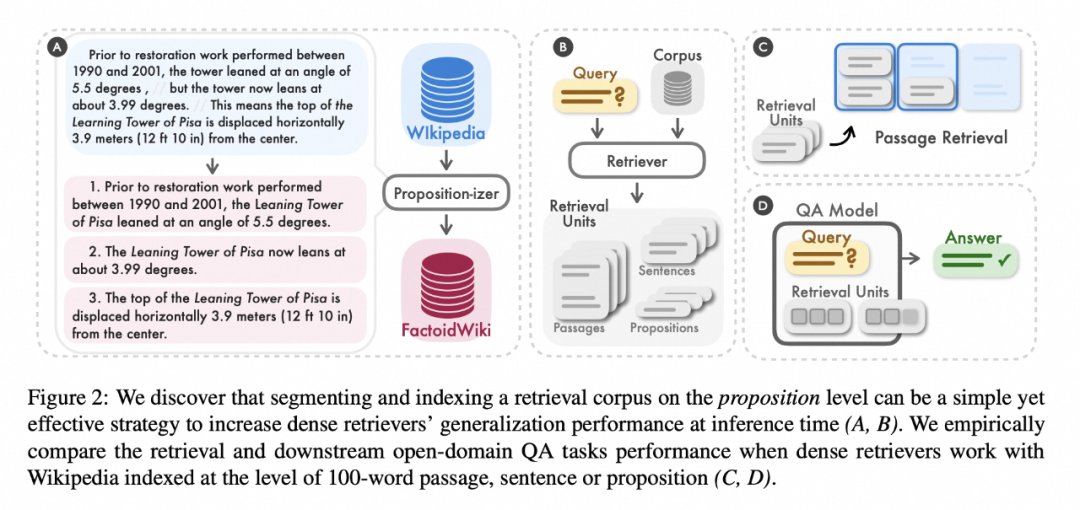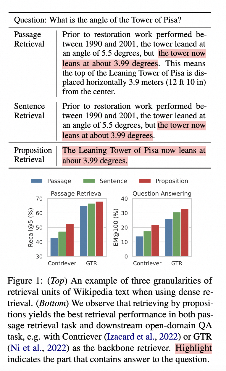 探讨在密集检索任务中,选择适当的检索单元粒度(如文档、段落或句子)的重要性,作者提出了一种新的检索单元“命题”(proposition),并通过实验证明,在密集检索和下游任务(如开放域问答)中,基于命题的检索显著优于传统的段落或句子检索方法。