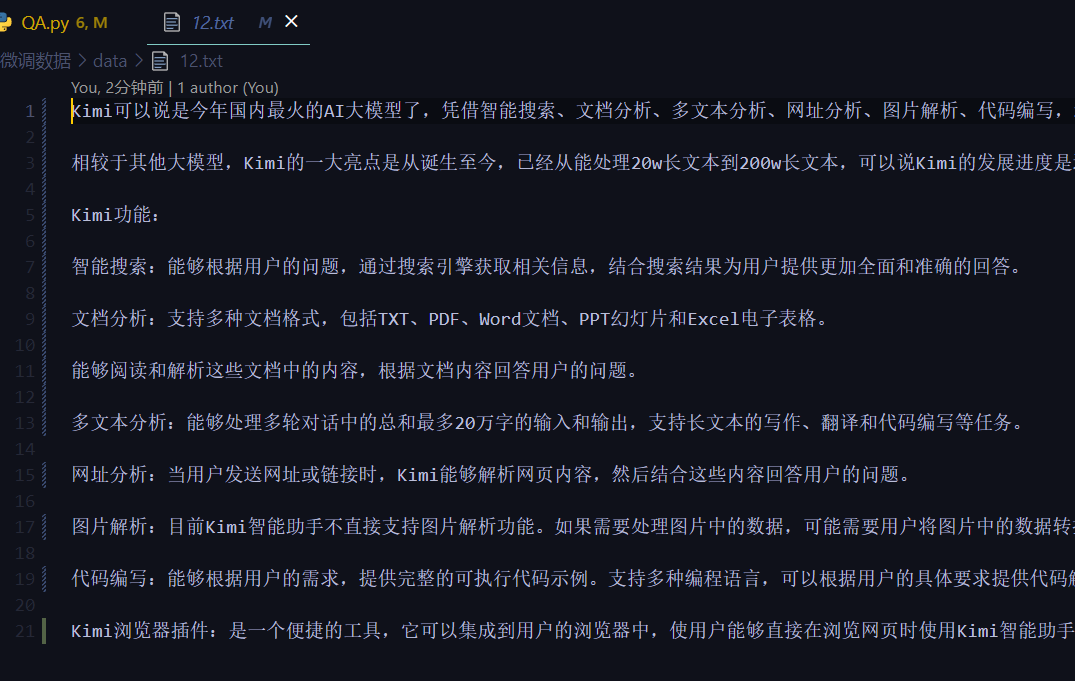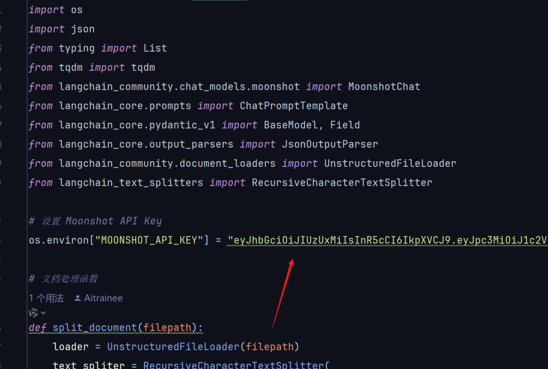 Kimi会针对分块来建立QA问答对。所以我们要先对传入的文档进行分块,这里假定输入的文档格式为txt,当然借助Kimi或者Langchain你可以编码以支持更多格式。