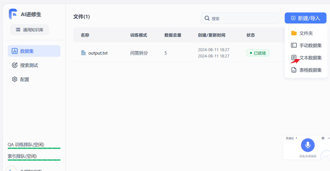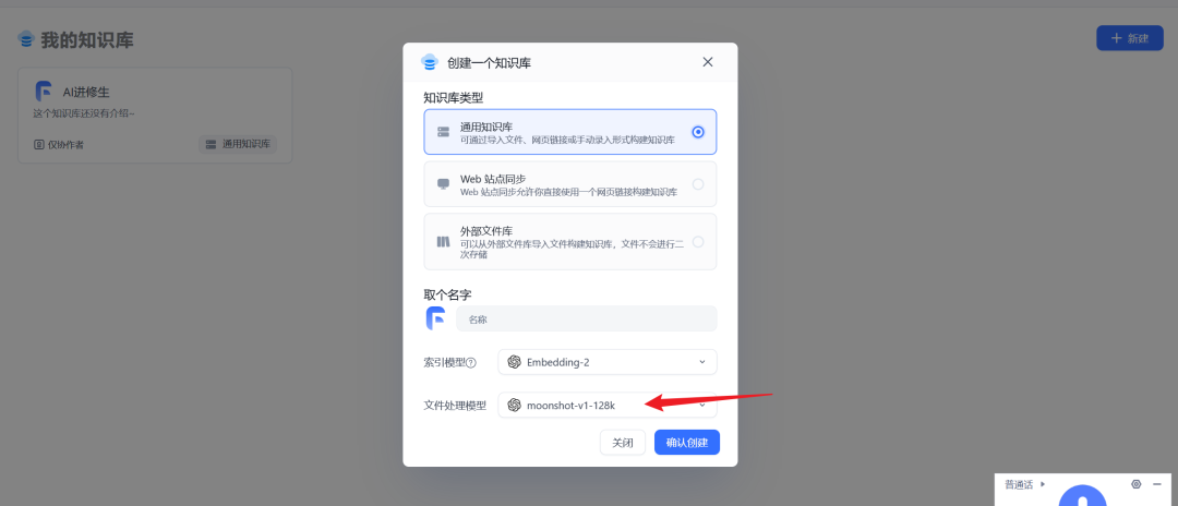3、在fastgpt中新建一个知识库,文本处理模型就选择moonshot-v1-128k