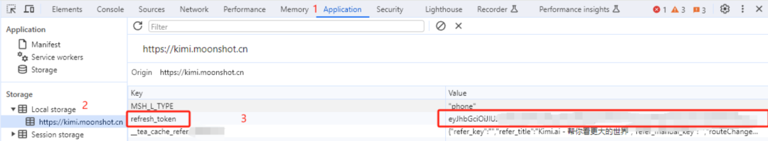 首先从 kimi.moonshot.cn 获取refresh_token,进入Kimi 随便发起一个对话,然后F12打开开发者工具,从Application > Local Storage中找到refresh_token的值,这将作为API Key。