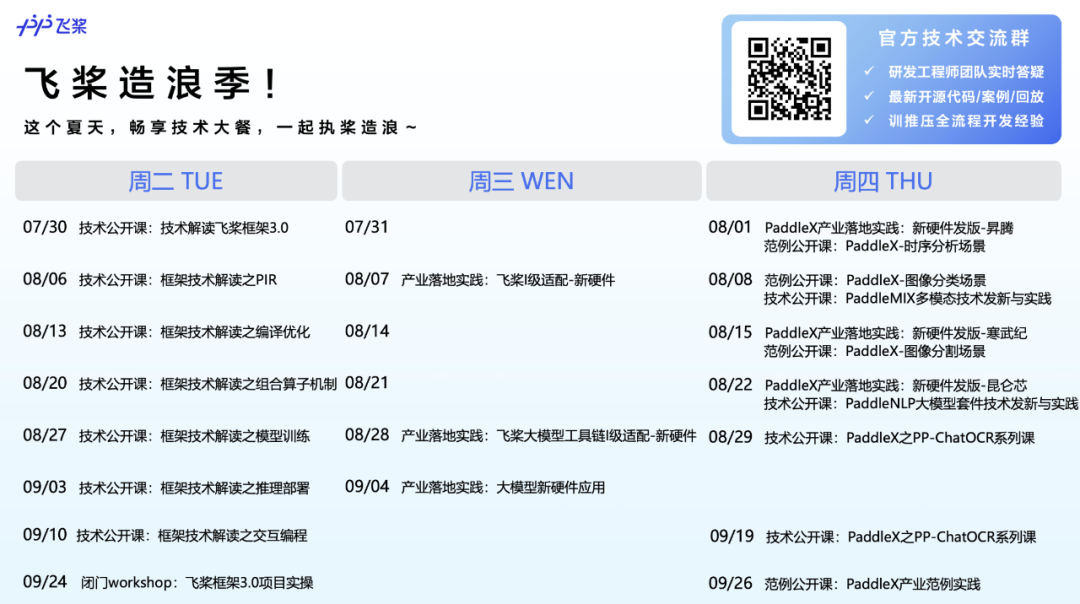 更多飞桨一手技术动态请关注飞桨造浪季系列活动,内容涵盖飞桨框架3.0、低代码开发工具PaddleX、大语言模型开发套件PaddleNLP、多模态大模型开发套件PaddleMIX、典型产业场景下硬件适配技术等多个方向,详情如下:
