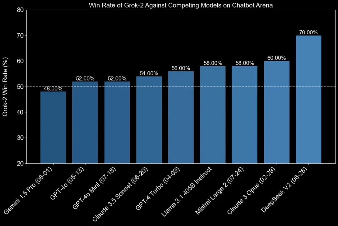 在这项广受欢迎的语言模型基准测试中,Grok-2的表现甚至超越了 Claude 3.5 Sonnet和 GPT-4-Turbo,足以见得其强大的能力。