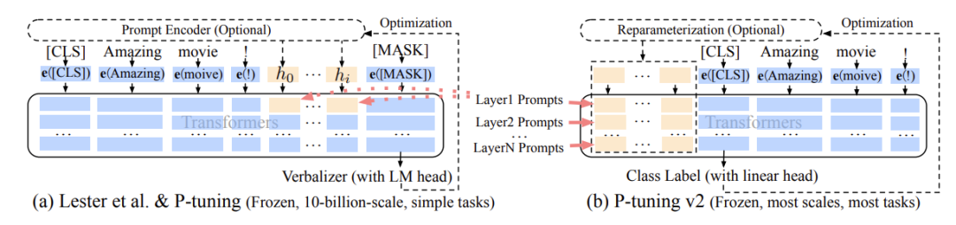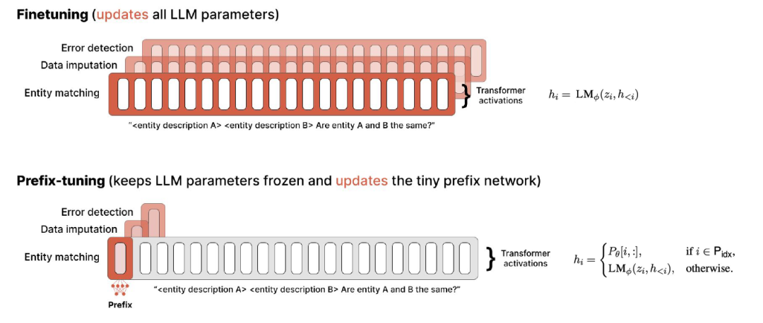 此外,通过全连接层(具有两层的迷你MLP和介于两者之间的非线性激活函数)来进行桥接。下图左侧为原始的Transformer块,而右侧为添加之后的Prefix Tuning架构。