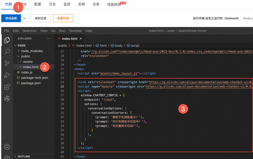 进入函数详情页后,在代码视图中找到public/index.html文件,然后取消③所在位置的代码注释即可。
