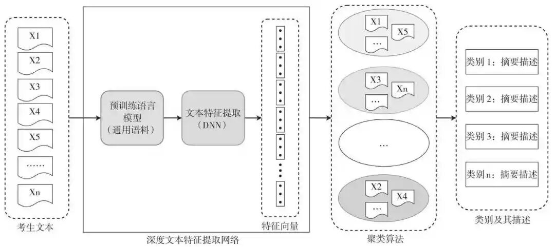 AI大模型技术对于理解考生作答内容也尤为重要。汇隽可之AI深度文本特征提取、聚类算法流程详见图4。