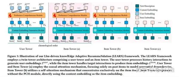 由此有了新的这个LEARN框架(Llm-driven knowlEdge Adaptive RecommeNdation),旨在有效融合大模型和推荐系统(LLM-to-Rec),更像是一种特征提取,LEARN框架通过双塔结构(用户塔和物品塔),利用LLM生成的Embedding来改进推荐性能。