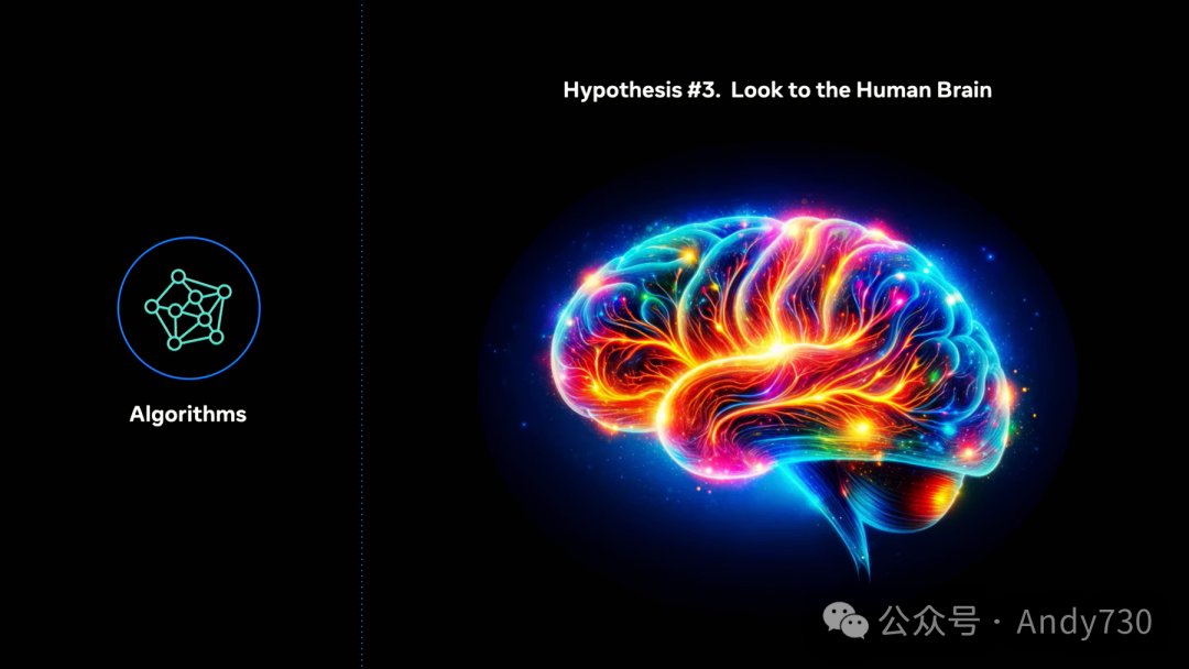机器学习的效率远低于人类学习。机器可获得新信息,但需要数十亿个参数和大量相似信息的曝光,而人类可以学习某个概念,立即获得洞察,并用这些洞察做决策。第三种假设认为,我们应从人脑中寻找新模型架构的线索。