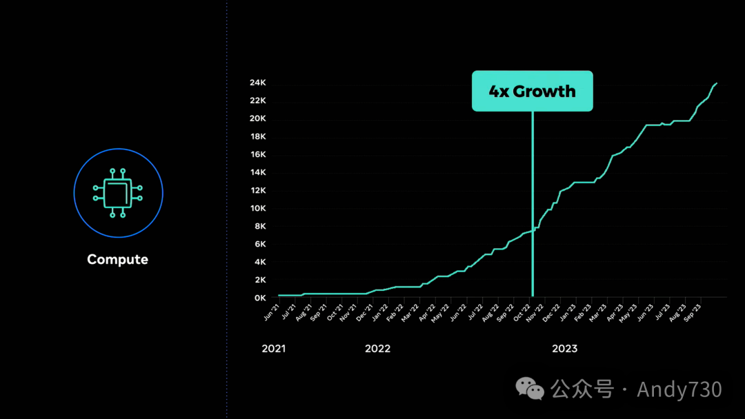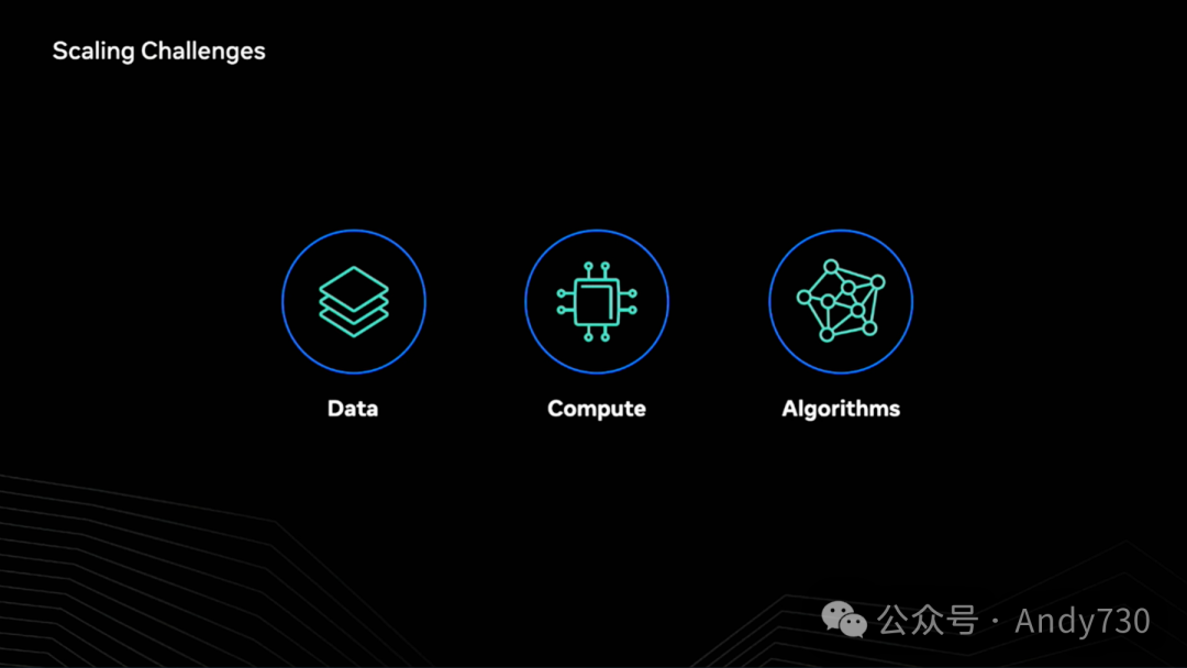 • 计算:随着模型训练需求以每年四倍的速度增长,GPU供应、能耗、故障处理等方面的挑战日益严峻。Meta正在开发自有芯片以应对这些挑战。