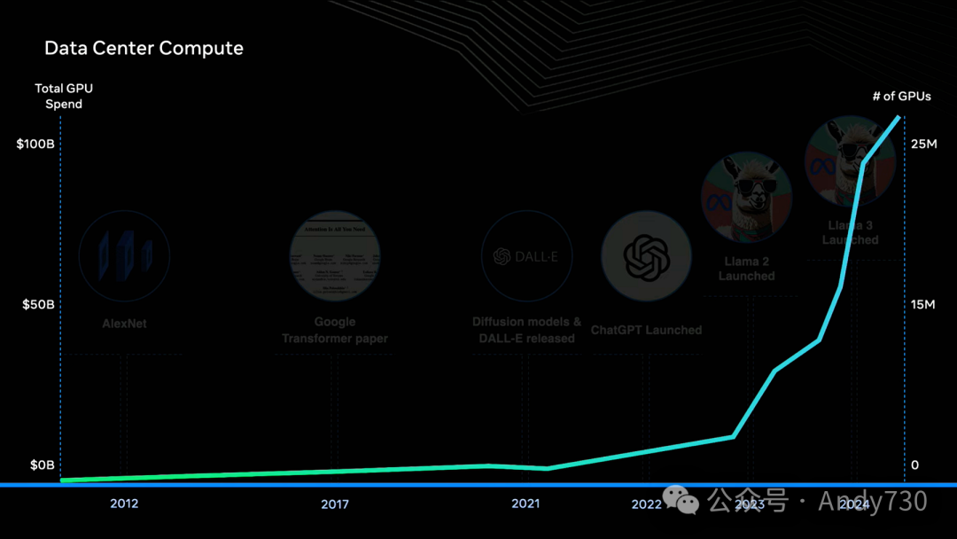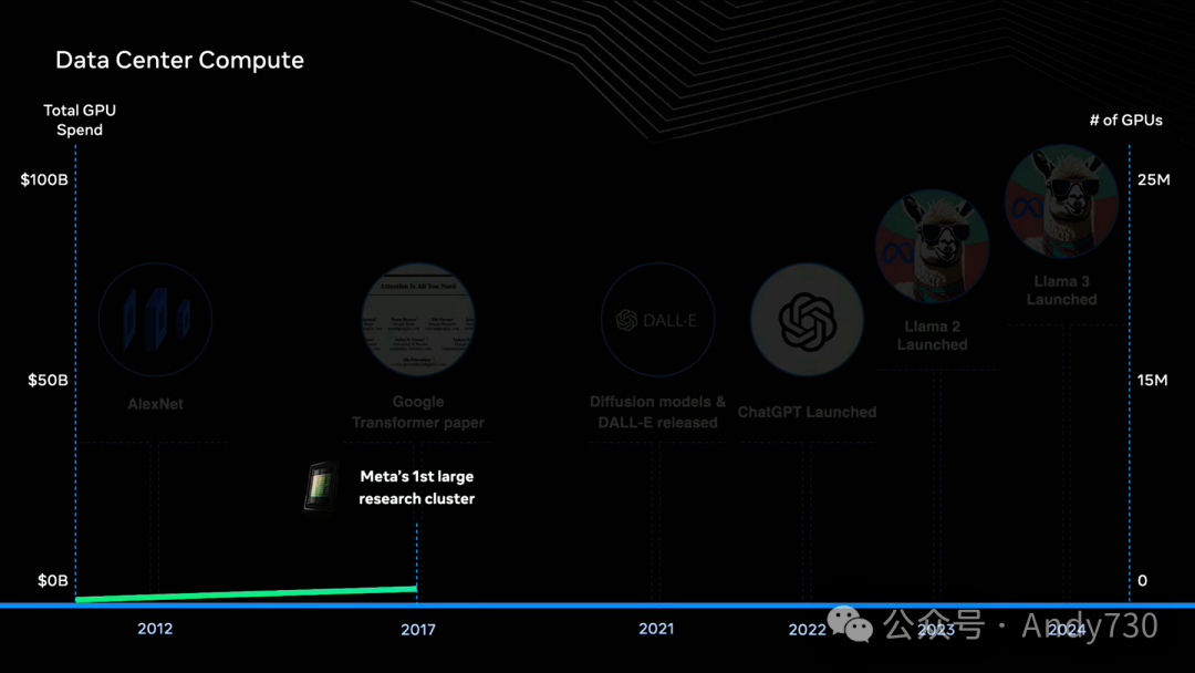• 数据中心演变与GPU的重要性:GPU在AI模型训练中的关键作用日益显著。特别是在ChatGPT发布后,GPU使用量急剧增加。Meta的数据中心正大规模增加GPU部署,以应对庞大的AI工作负载。