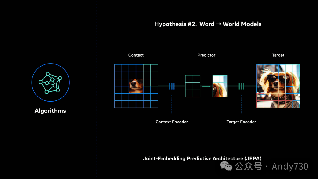 第二种观点认为,模型需要对世界有更扎实的理解——这种理解来自探索、实验和互动,类似儿童与世界互动的方式。因此,有一种假设认为我们需要世界模型(world models)来进行前向模拟,提高规划和准确性。这一理念驱动了我们实验室的部分研究工作,我们团队正在研究联合嵌入预测架构(JEPA,Joint Embedding Predictive Architectures)。