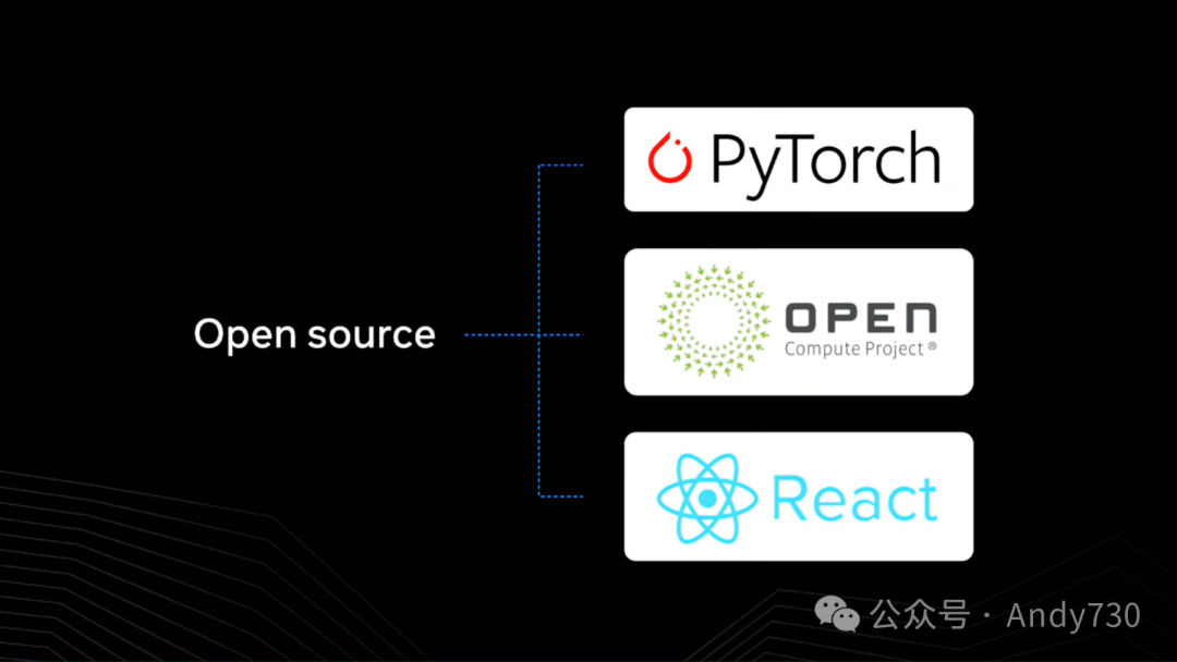 我们有开源底层基础设施的悠久历史,无论是开源数据中心设计的Open Compute Project,还是用于构建用户界面的React。更贴近我们的是PyTorch,目前最主流的机器学习开发库。我们将继续在这些基础上进行社区建设。