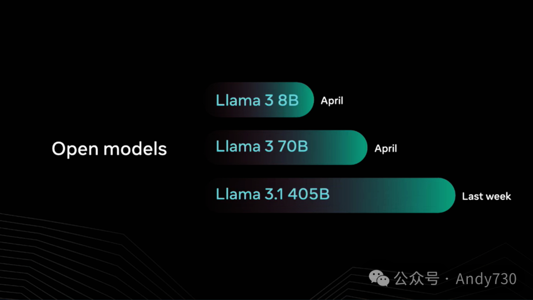 五年后,Google发表《Attention Is All You Need》,引入Transformer模型概念,推动了大规模语言模型的创新:Google的BERT,随后是GPT。2021年,扩散模型崭露头角,DALL·E展示了惊人的文本生成图像能力。2022年11月,ChatGPT将这些模型突破带入公众视野。2023年,Meta开放LLaMA 2供研究和商用。随后我们推出LLaMA 3,包括700亿和80亿参数模型,上周发布了450亿参数的LLaMA 3.1,这是首个前沿级开源AI模型。这些发布引发了行业创新浪潮,并围绕LLaMA建立了完整生态系统。