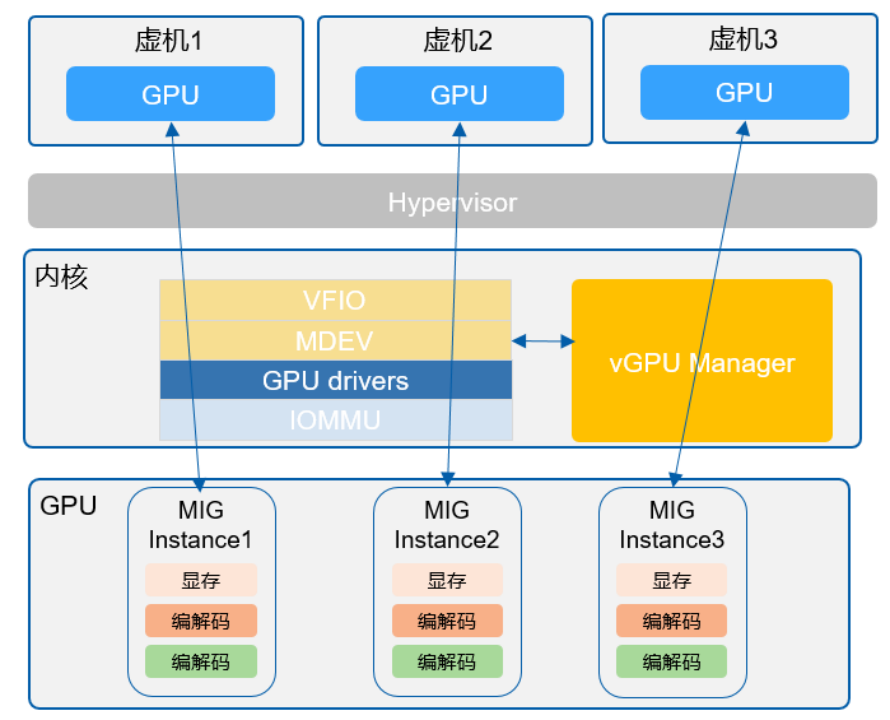 1. 资源切分: 显存和算力按照 MIG 硬件的切分方式,直接分配给虚拟机。