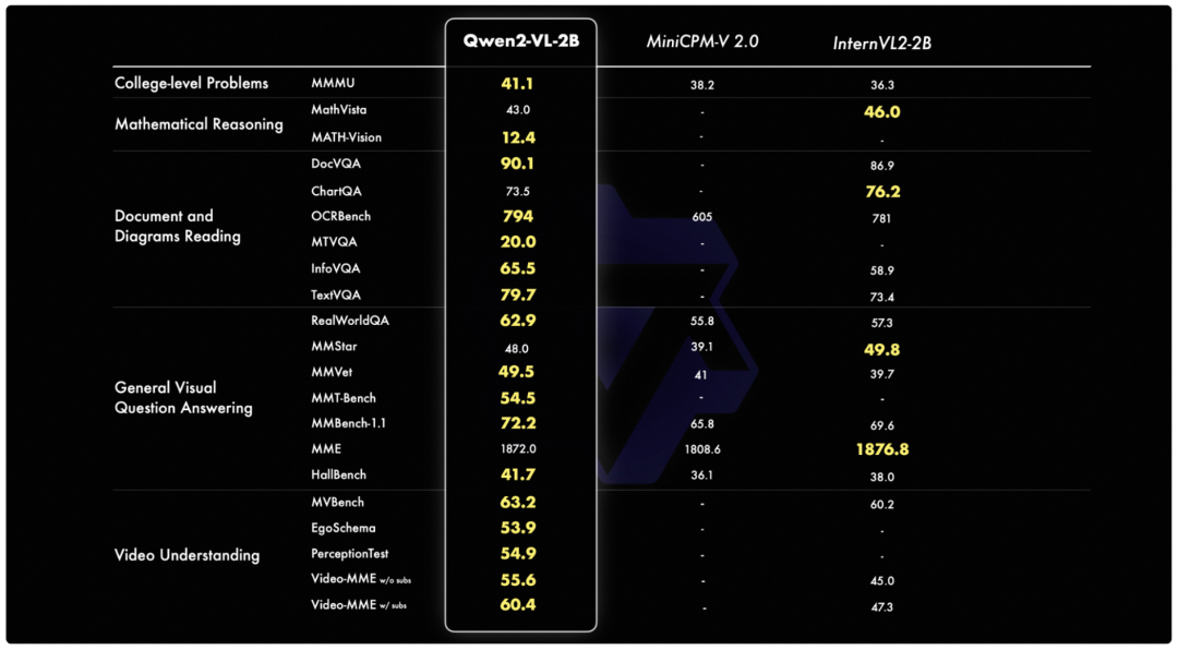 · 增强的图像理解能力:Qwen2-VL显著提高了模型理解和解释视觉信息的能力,为关键性能指标设定了新的基准