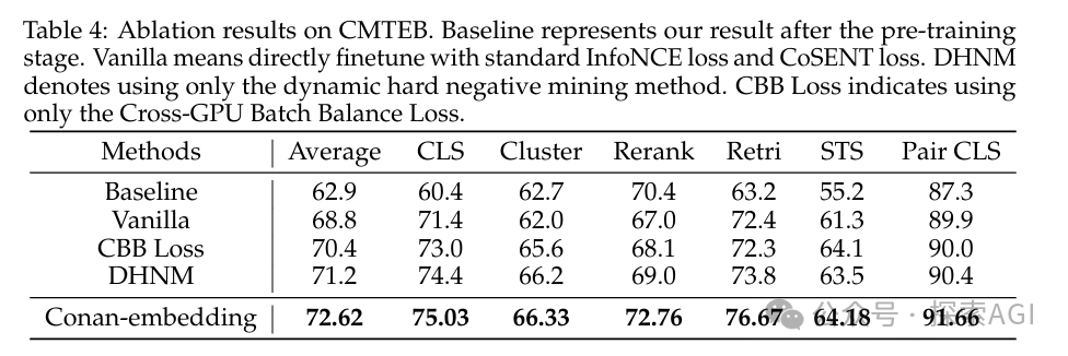 Conan-embedding在CMTEB的六个任务上都取得了优异的成绩,超越了之前所有的模型。消融研究也证明了动态硬负样本挖掘和CBB Loss这两个方法的有效性。