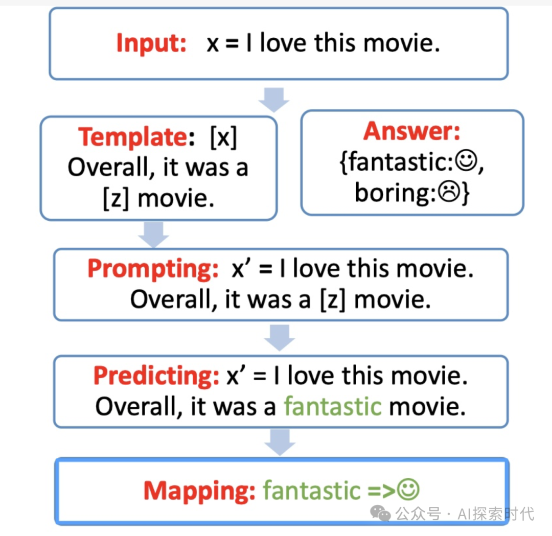 而不加提示词模板,模型给出的答案可能就千奇百怪,比如说这是一个难看的电影,这是一个糟糕透顶的电影,这是一个某某主演的关于某某事情的电影等等,都是有可能的。