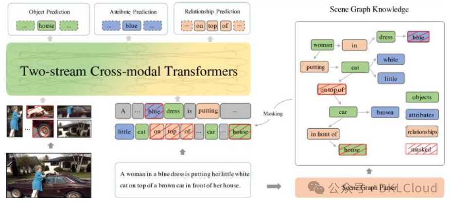 例如,在场景图知识的利用上的一个典型方法是百度的ERNIE-ViL模型,如图3-6所示,它在视觉-语言模型中引入了由文本解析而来的场景图信息,在预训练过程中通过将场景图中的知识实体和关系进行掩码后要求模型预测所掩码位置的知识信息,以此作为更细的多模态预训练任务,这能够使得模型更能精准把握图像和文本之间细粒度的对齐信息。