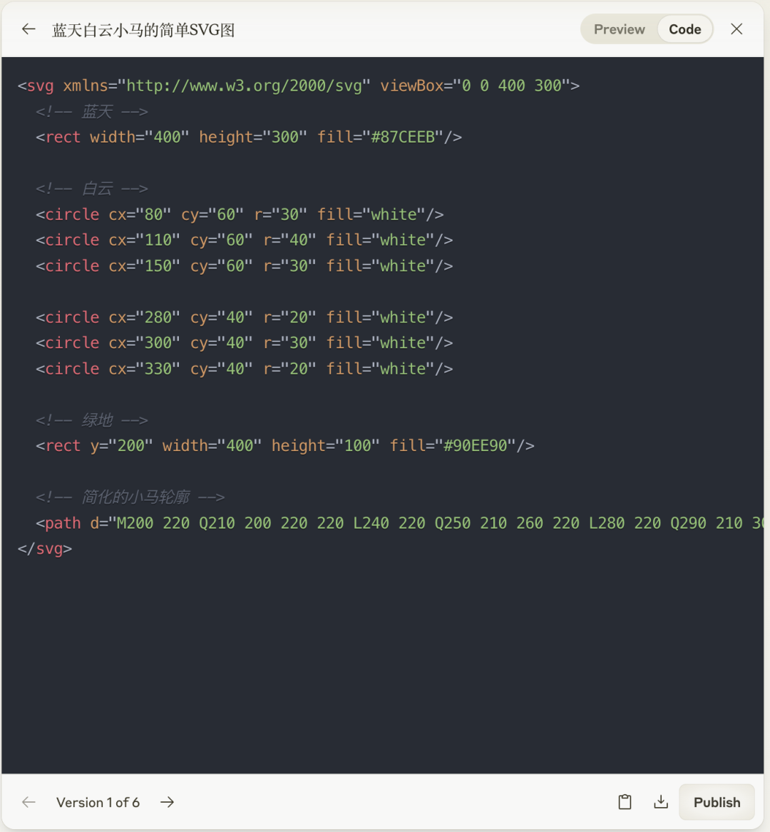 上面的例子都是写代码,除此之外,Claude还会绘图。它虽然不具备Midjourney或者Dalle这样的文生图能力,但它可以生成SVG,通过矢量图的方式来制作简单的图像。比如简笔画“蓝天白云小马”: