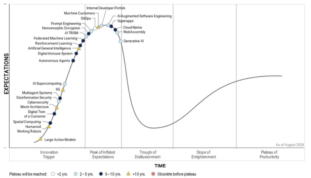 根据Gartner近期发布的技术成熟度曲线,生成式AI(Generative AI)目前处于曲线最顶峰的右侧,这表明大模型虽然还在热度期内,但已奔向了落地的实际周期