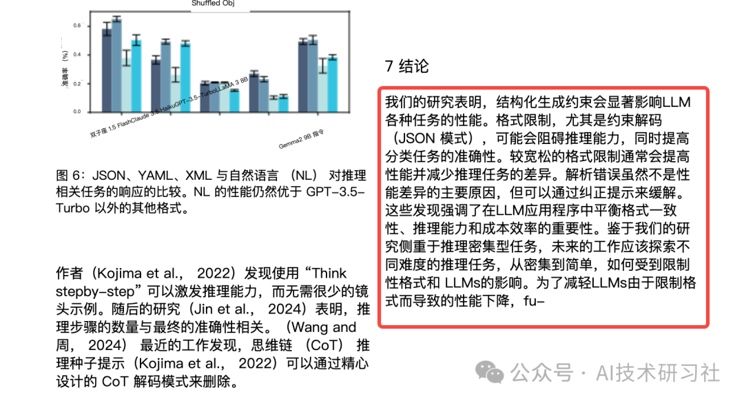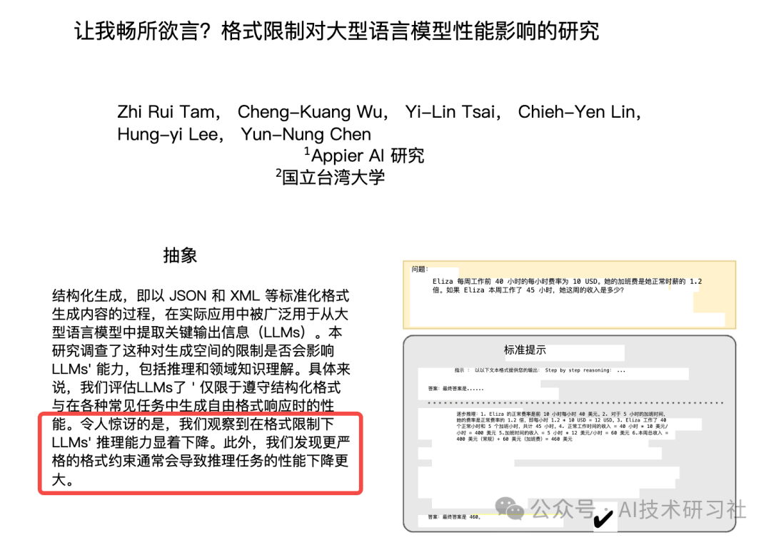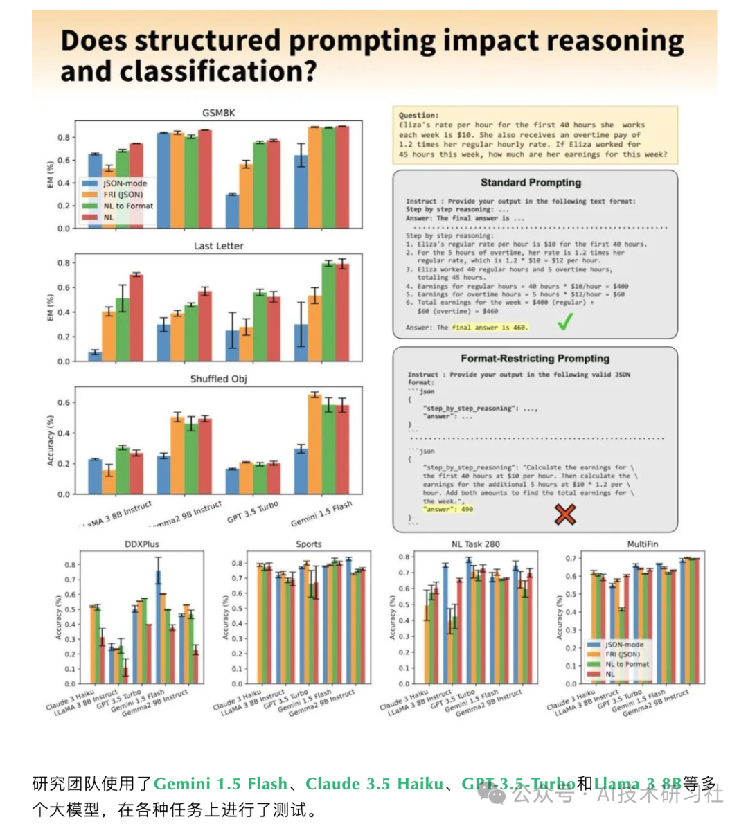 结构化的表达方式极大地减轻了人类用户和GPT模型的认知负荷,显著提升了双方对Prompt语义的理解和把握。对于用户而言,这种清晰的结构使得Prompt内容直观易懂,语义分明,用户只需简单模仿即可轻松编写Prompt。更进一步,借助LangGPT提供的Prompt生成助手,用户还能高效地创建出高质量的初步Prompt。 这些生成的初步Prompt足以应对大多数日常使用场景,而对于生产级别的应用场景,也可以在这些初版Prompt的基础上进行迭代和优化,从而大幅减少编写Prompt的工作量。 对于GPT模型而言,结构化的层级标识符有助于集中处理相同语义的信息,梳理和组织语义内容,降低了模型对Prompt理解的复杂度。此外,属性词的使用对Prompt内容进行了有效的语义提示和归纳,减轻了不当内容对模型理解的干扰。通过将属性词与Prompt内容相结合,形成了清晰的局部总分结构,使得模型能够更加高效地把握Prompt的整体语义。 然而,最近一群研究人员在一篇名为"Let Me Speak Freely"的论文中专门研究了结构化格式对AI性能的影响。结果显示,这些所谓的"规矩"可能正在限制AI的思考能力! 结构化提示词正在让我们的AI变笨!是的,那些让AI乖乖按照JSON、XML格式输出的复杂提示词,可能并不如我们想象中那样好。