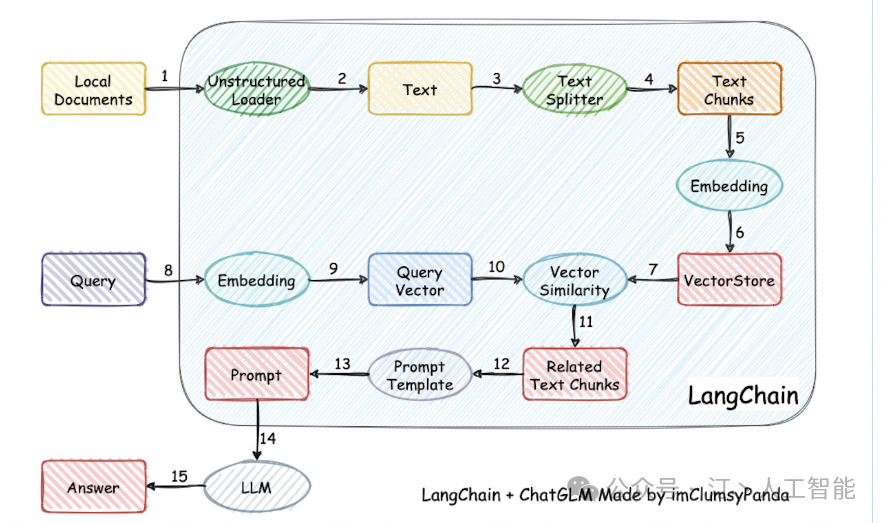 原理如下图所示:过程包括加载文件 -> 读取文本 -> 文本分割 -> 文本向量化 -> 问句向量化 -> 在文本向量中匹配出与问句向量最相似的 top k个 -> 匹配出的文本作为上下文和问题一起添加到 prompt中 -> 提交给 LLM生成回答。