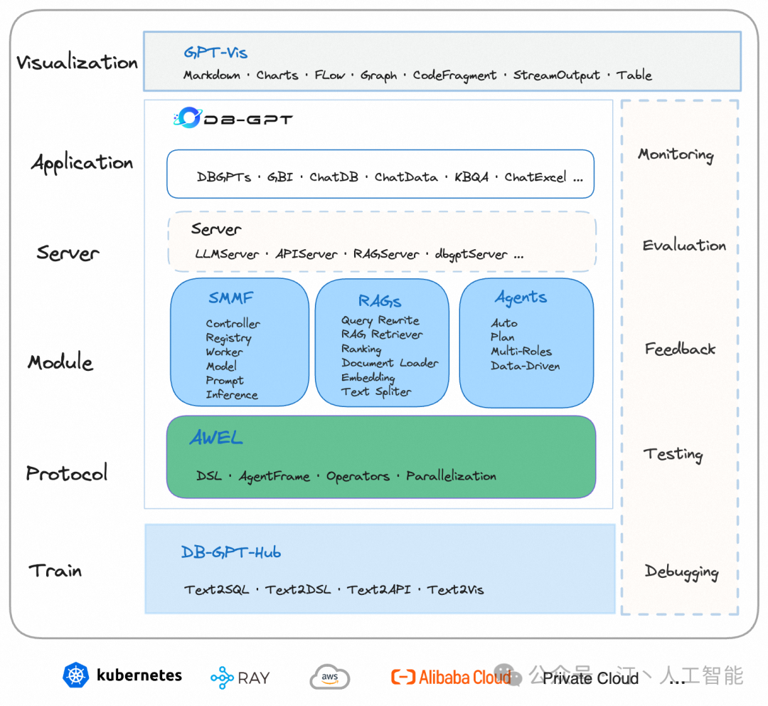 数据源: 对接各类数据源,实现生产业务数据无缝对接到DB-GPT核心能力。