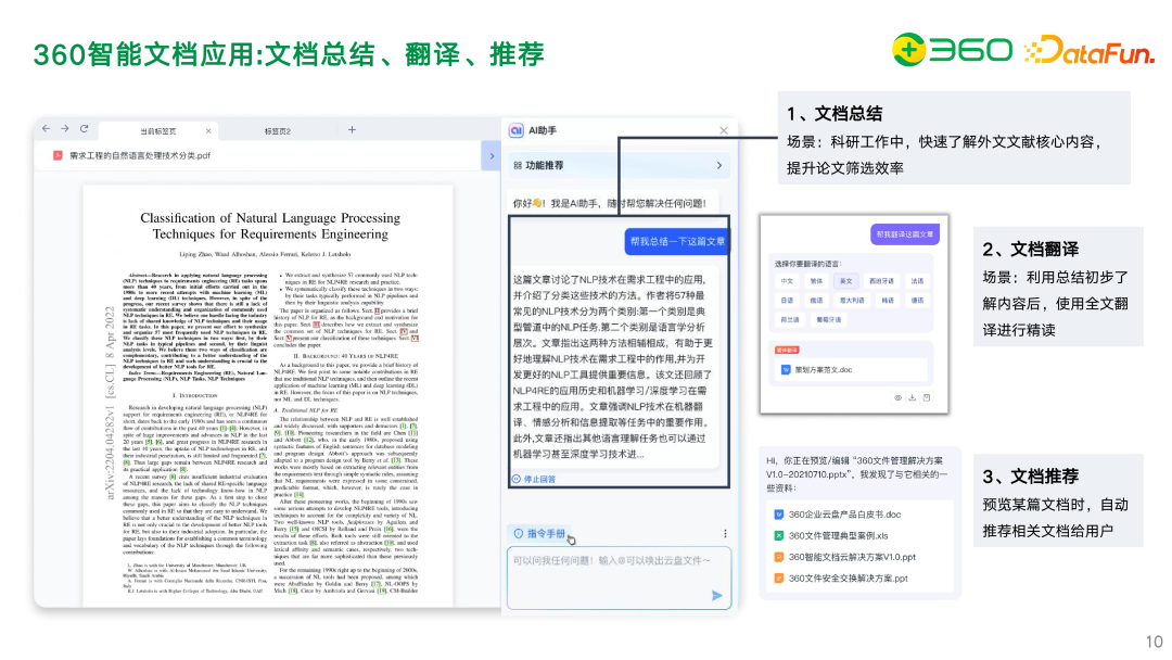360 智能文档还可应用于文档总结、文档翻译、文档推荐。
