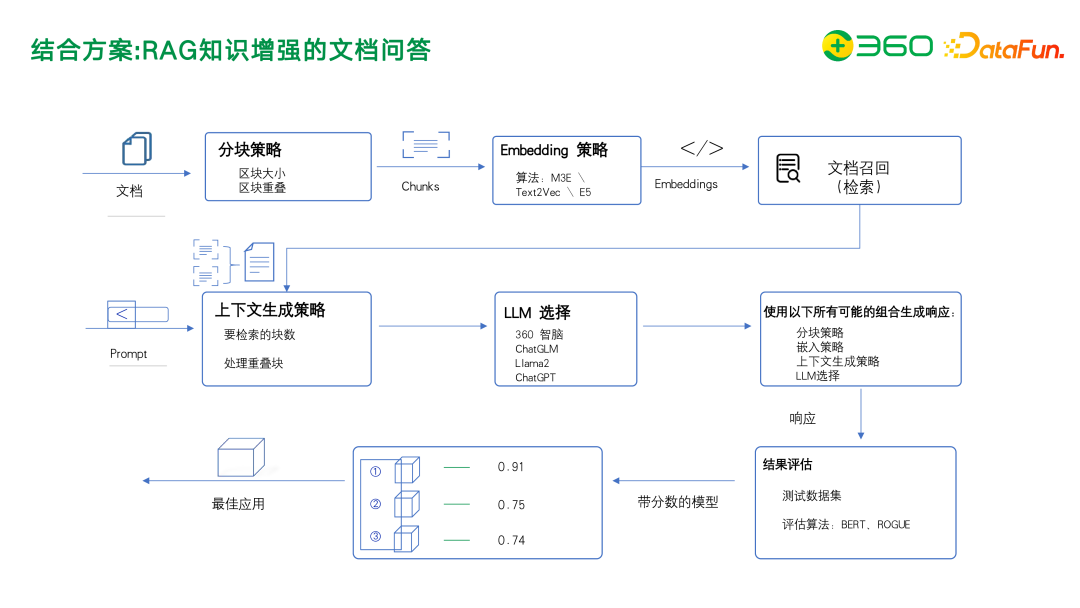 搜索问答最强的是 RAG。RAG 知识增强的文档问答流程为:首先将文档根据策略进行分块,Chunks 之后使用一些比较好的 Embedding 策略包括:M3E \Text2Vec \ E5,再去做文档召回。文档召回完后制定上下文生成策略,包括要检索的块数、处理重叠块等,接着选特定的模型比如 360 智脑、ChatGLM、Llama2、ChatGPT 等,然后使用所有可能的组合比如分块策略、嵌入策略、上下文生成策略 LLM 选择等生成响应,之后再做结果评估,最后根据带分数的模型得到最佳应用。
