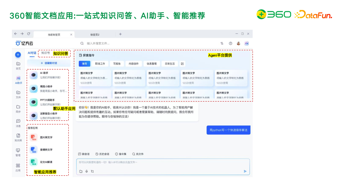 360 智能文档知识管理应用上的功能包括:一站式知识问答、AI 助手、智能推荐。比如通过创建知识号把文档上传后进行提问,也有默认助手应用,可做应用推荐,可加入大模型相关推荐,还可以集合 Agent 平台的产品。在云盘文档类有很多应用场景,比如图片转文字、PDF 转 DOC 等。