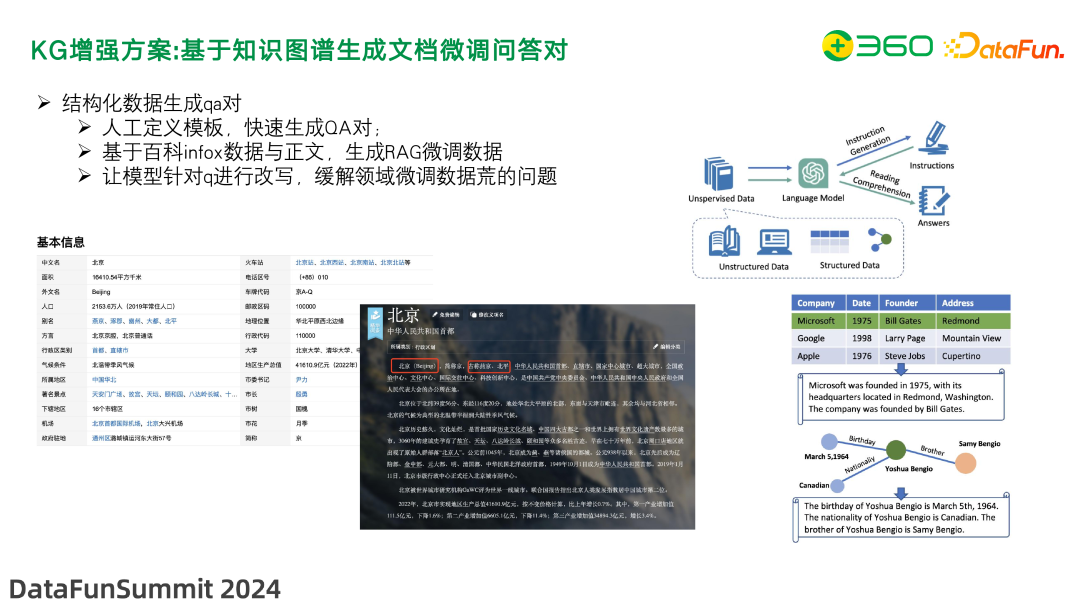 知识管理可以通过图谱生成微调问答对。我们通常基于结构化数据生成 QA 对,通过人工定义模板,快速生成 QA 对;基于百科 infox 数据与正文,生成 RAG 微调数据;让模型针对 Q 进行改写,缓解领域微调数据荒的问题。
