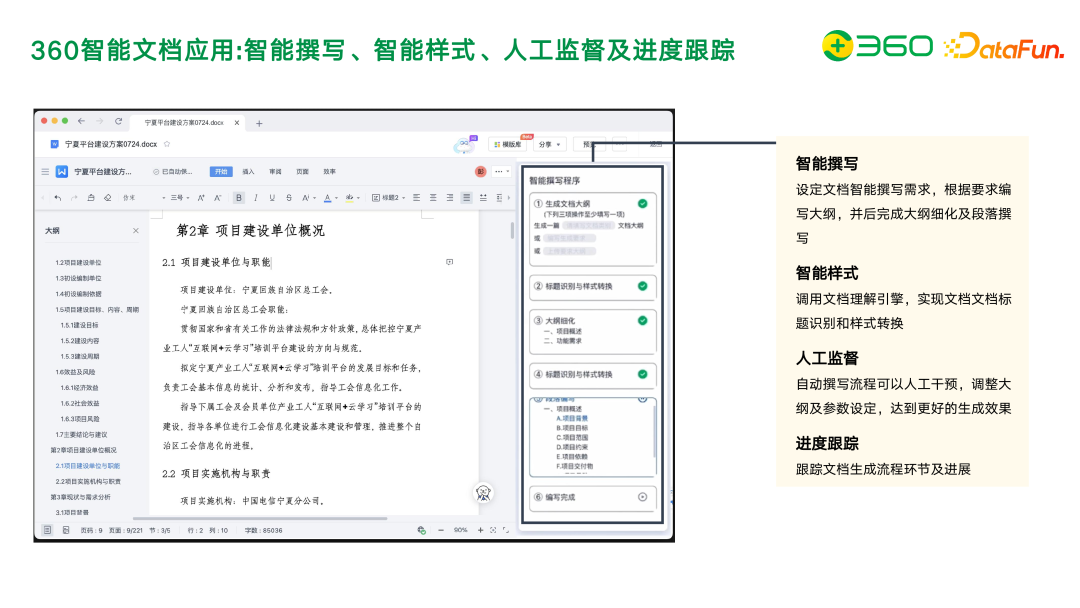 在大模型到来之后,360 智能文档在智能撰写、智能样式、人工监督、进度跟踪等方面可以发挥作用。