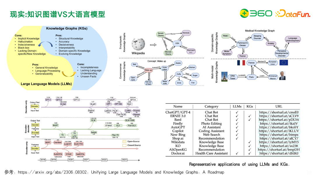 大模型来了之后,有一篇很火的文献综述《Knowledge Graphs》梳理了大模型和知识图谱的优势、劣势。大模型知识边界不敏感,优势在于超高度超数化、容易起量,但不精细;知识图谱很精细、很结构化,但是不完整。现在有很多模型出来,包括 ERNIE3.0 做知识图谱增强,Doctor AI 做知识图谱增强、融合。
