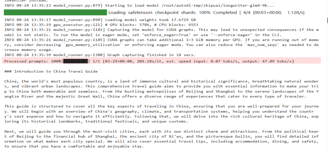 使用加载好的模型进行文本生成。可以使用 query = "写一篇 10000 字的中国旅游指南" 这样的查询语句,通过model.chat得到生成的响应内容。