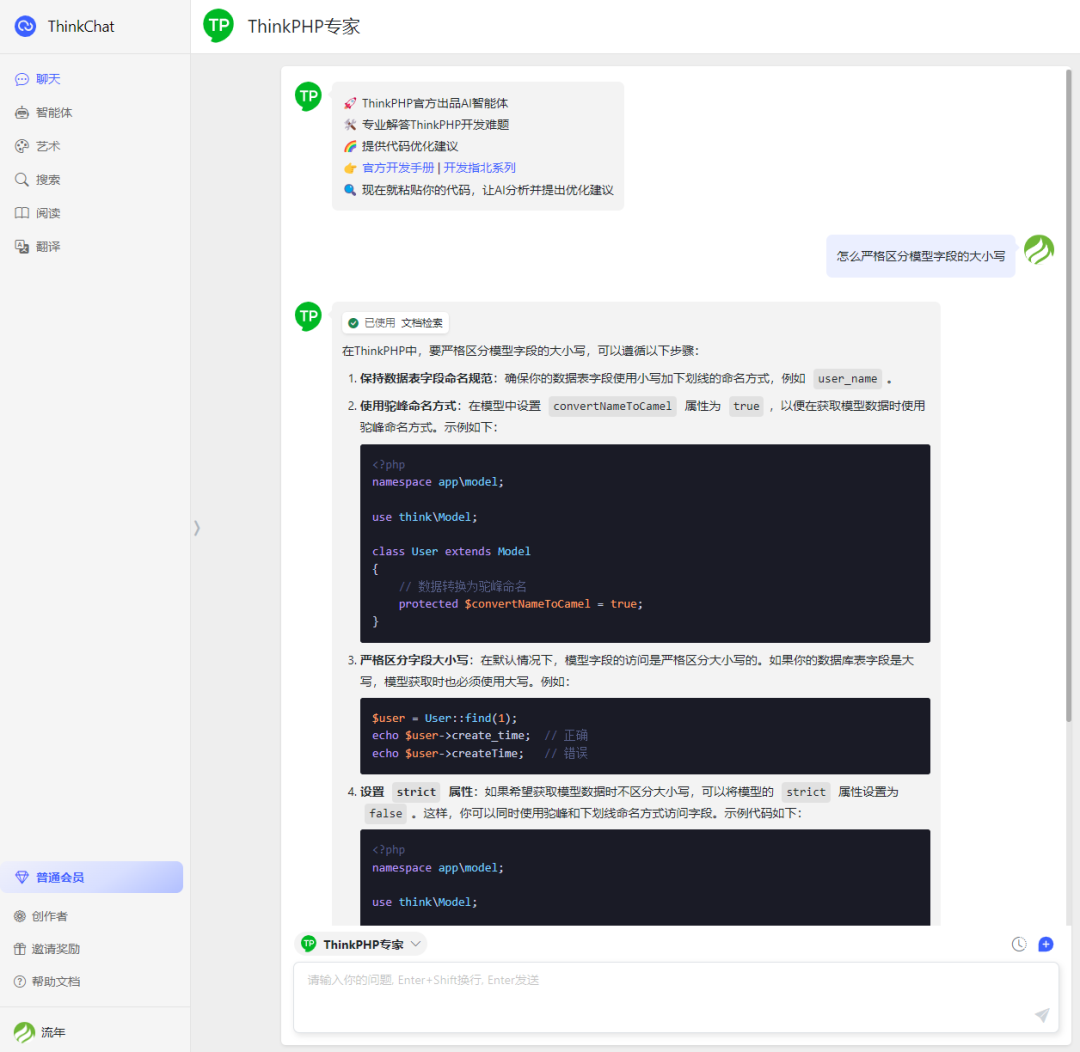 ThinkChat的智能体商店已经上线了ThinkPHP官方的AI开发智能体,基于官方手册进行了一系列的数据训练和提示词设置优化,而且支持联网查询,可以为TP开发者提供更智能和更精准的问题解答和建议,比自己查手册更快,而且比较容易得到有效的答案,希望能帮到广大ThinkPHP开发者。 很多新手遇到问题不知道怎么查手册、百度的很多结果又难以判断,而且不具备针对性。AI开发助理利用先进的人工智能技术,配合ARG方案,可以根据开发者提供的问题和需求,快速给出准确的解答和建议。无论是在代码编写、调试、优化还是部署等方面,AI开发助理都可以提供专业的指导和帮助,大大节省开发者的时间和精力。
