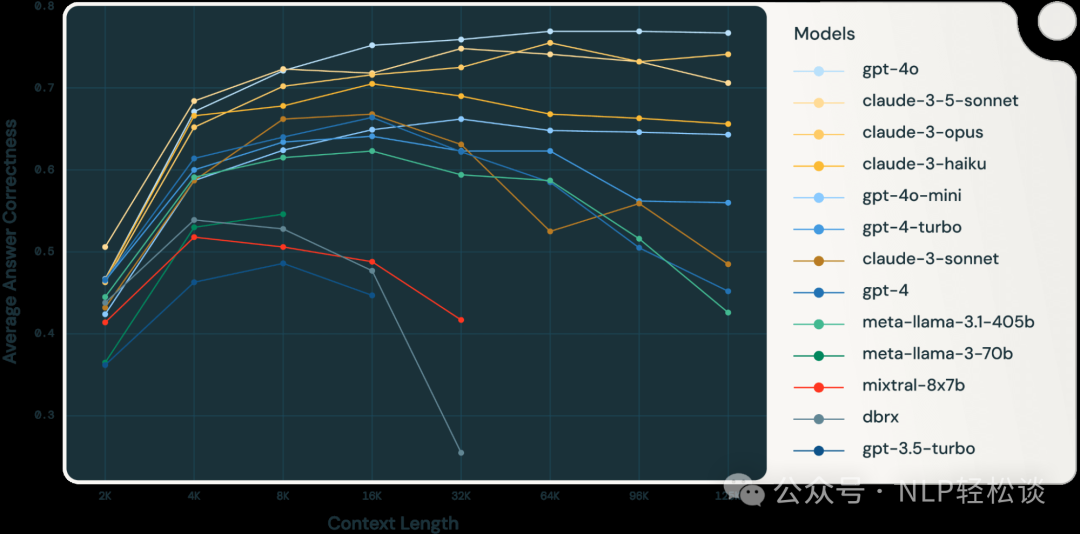 3. 近期的模型如 gpt-4o、claude-3.5-sonnet 和 gpt-4o-mini 展现了改进的长上下文处理能力,几乎没有性能下降。